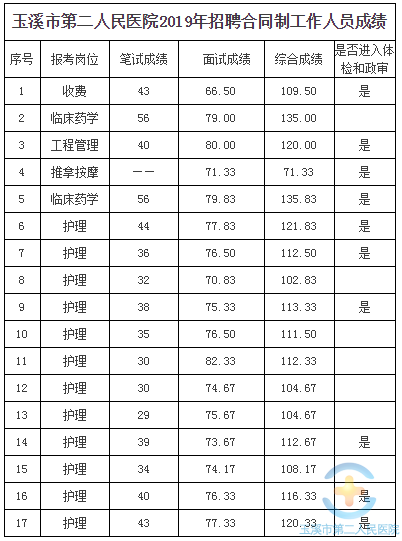根据《玉溪市第二人民医院2019年招聘合同制工作人员公告》有关规定,经报名、资格审查、笔试、面试,现将综合成绩公布如下:
