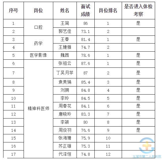 按照《玉溪市第二人民医院2019年提前招聘编制内紧缺、高层次医学人才公告》玉溪第二人民医院提前招聘工作已全面结束,现将参加提前招聘人员的成绩进行公布,体检和考察的时间另行通知。