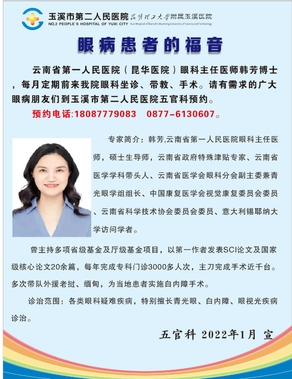 我院眼科专家工作站韩芳博士将于2022年8月21日上午08:00-11:30到我院坐诊,欢迎广大患者前来就诊。