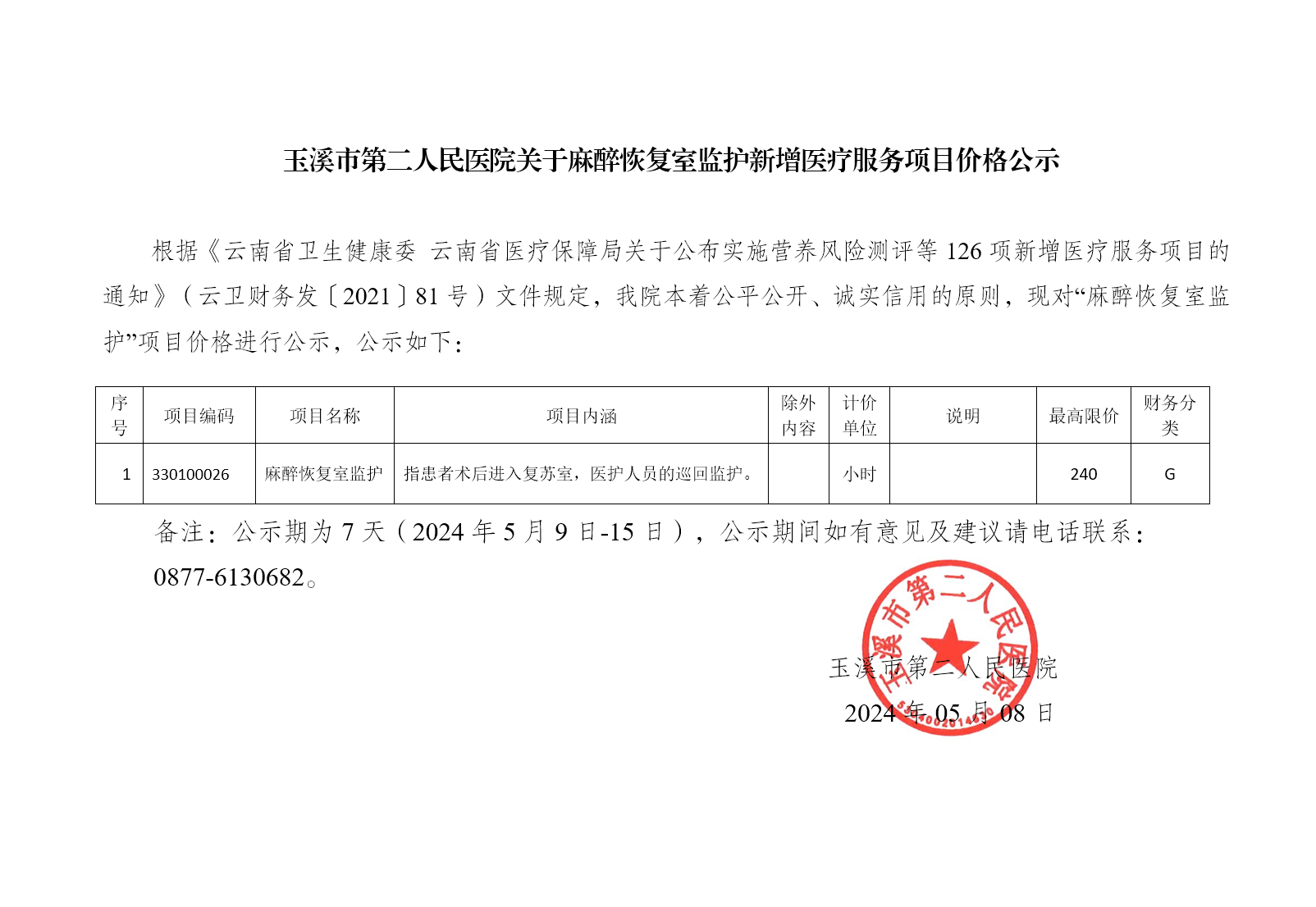 玉溪市第二人民医院关于麻醉恢复室监护新增医疗服务项目价格公示