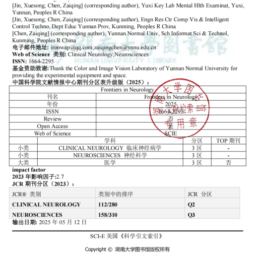 近日,玉溪市第二人民医院与云南师范大学联合开展的脑科学领域研究取得重要进展,相关成果以《Prefrontal cortex activity during binocular color fusion and rivalry: an fNIRS study》为题,在国际神经科学权威期刊《Frontiers in Neurology》上正式发表。该研究由玉溪市第二人民医院(玉溪市精神健康专科测查重点实验室)与云南师范大学(云南省教育厅计算机视觉与智能控制工程技术研究中心)联合完成,硕士研究生刘翔为第一作者,实验室负责人金雪松(玉溪市第二人民医院信息网络中心主任)与云南师范大学陈载清教授为共同通信作者。