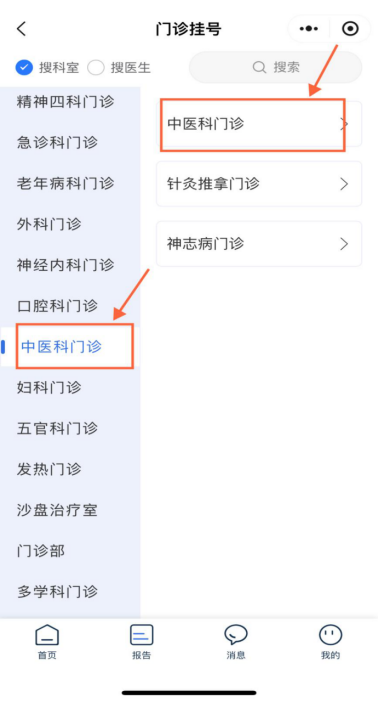 3.进入“科室挂号”页面,下拉点击“中医科门诊”