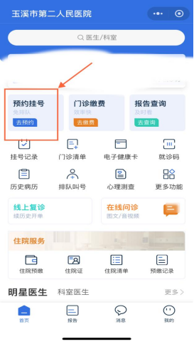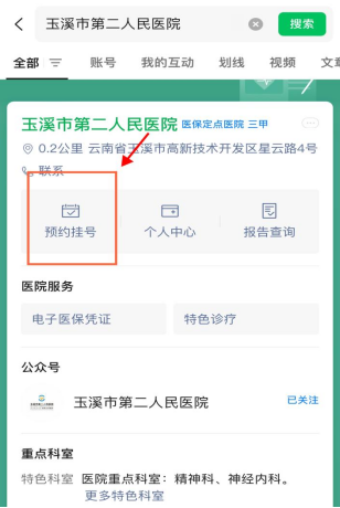 1.在微信搜索栏,搜索“玉溪市第二人民医院”,出现图片上内容后点击“预约挂号”