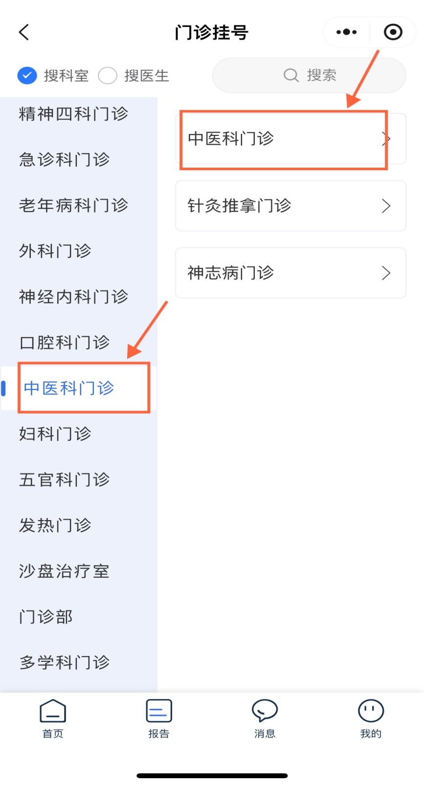 3.进入“科室挂号”页面,下拉点击“中医科门诊”