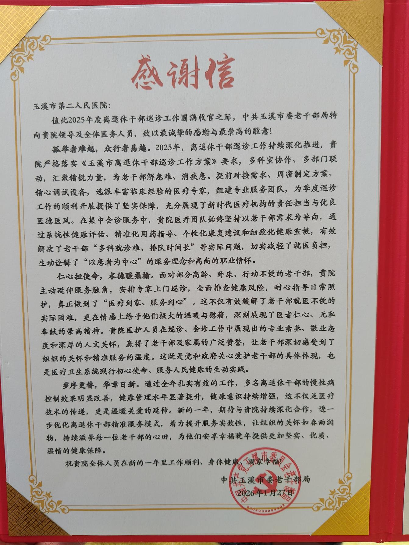 近日,我院收到玉溪市老干部活动中心发来的感谢信,信中对医院长期以来为离退休干部提供的义诊、入户巡诊、心理健康讲座、心理健康筛查等系列健康服务给予高度评价,字里行间满含对我院专业服务与责任担当的认可与敬意。