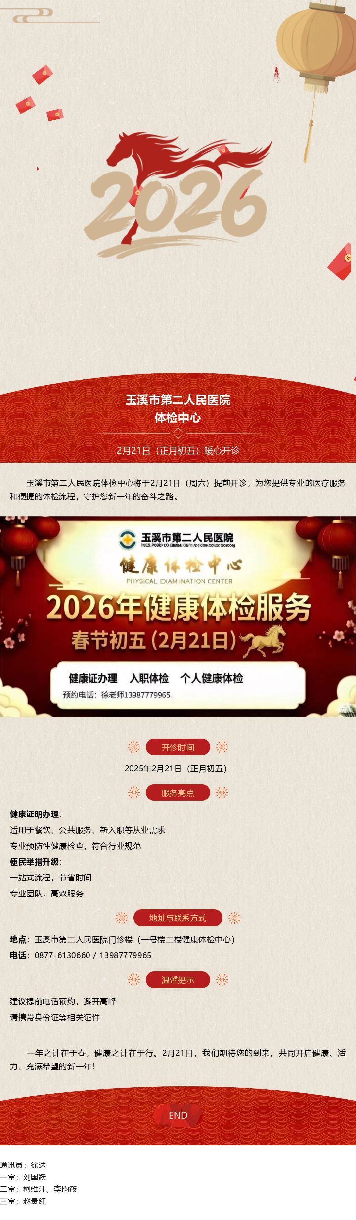 玉溪市第二人民医院体检中心2月21日(正月初五)暖心开诊