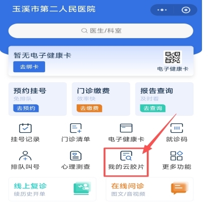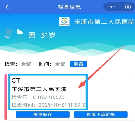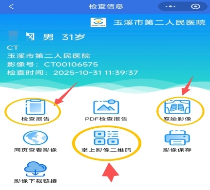 本流程适用于在玉溪市第二人民医院完成检查后,通过微信小程序查阅电子报告、原始影像及分享影像,无需领取纸质胶片,随时随地查看。对患者来说最为受益。医保影像云将长期、全量、保存管理参保人员的影像检查资料,这等于建成了一个个人医疗影像资料库,有利于个人健康管理;另外,以前患者在不同的医疗单位做了检查后,即使带着胶片走,也存在一些清晰度不足的问题。如今,电子胶片清晰度更高,原始信息更为丰富,医生诊断更为清晰方便。